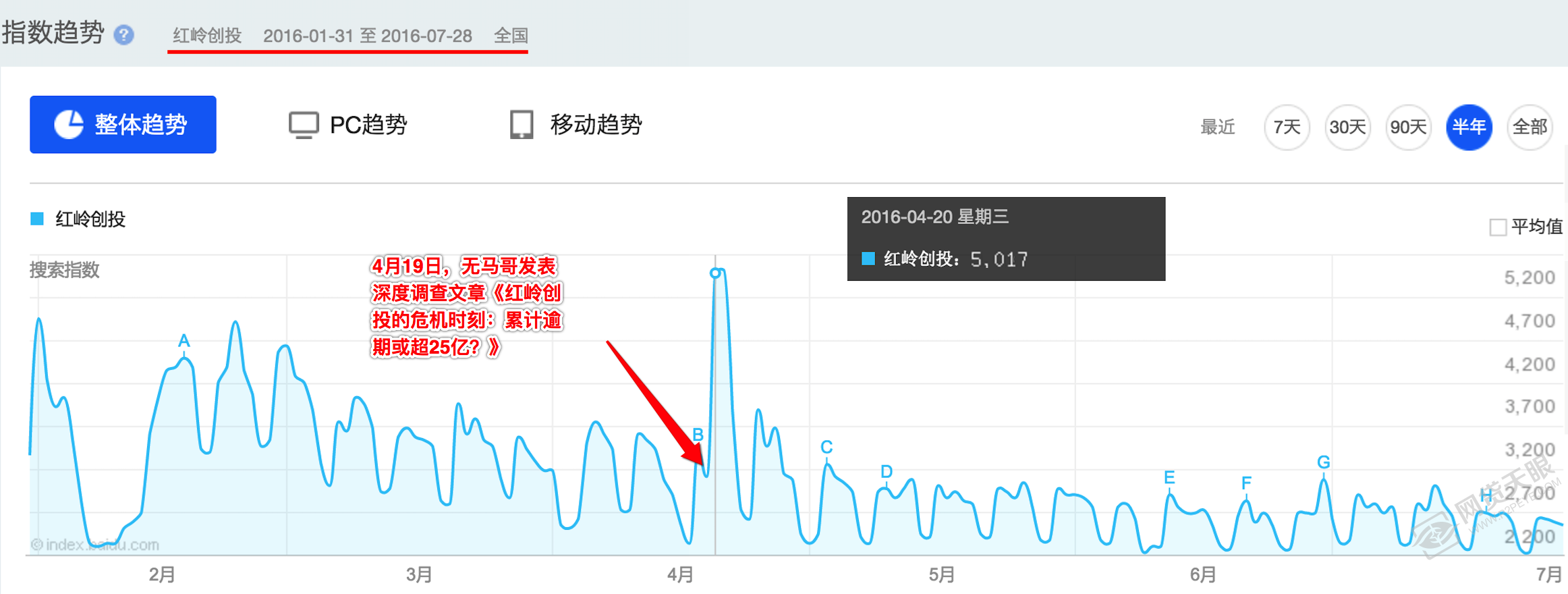 半年来大家对红岭创投的百度搜索量最高峰,发生在无马文章发表后的4月20~21日