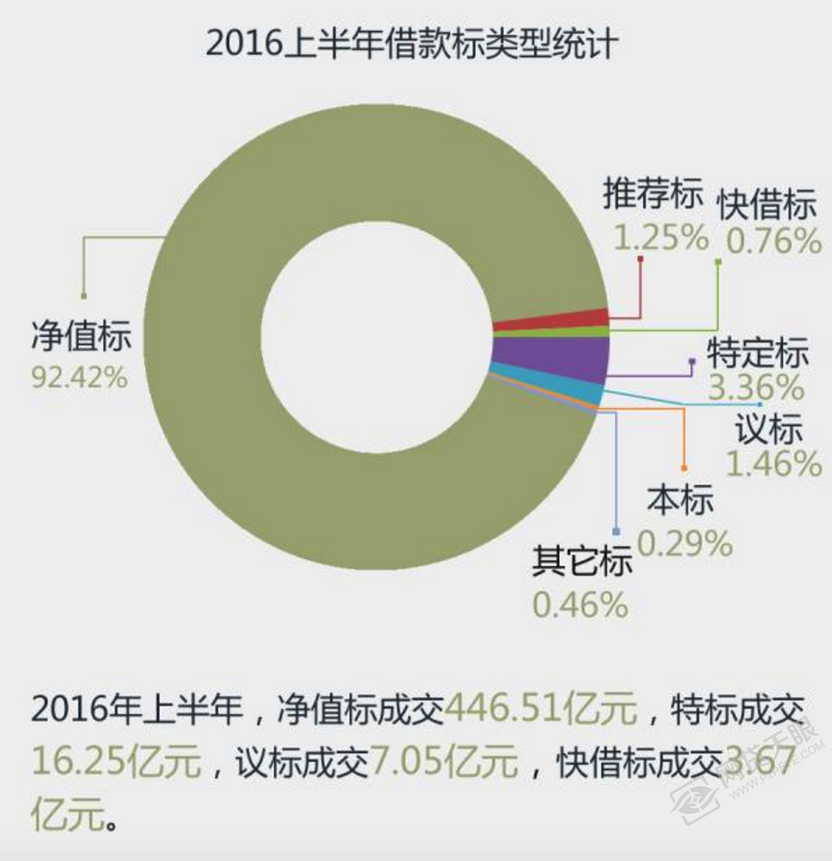 在红岭的2016上半年运营报告中,找不到关于这些新业务的具体数据。跟不同业务占比有关的,是下面这个图表。在上半年红岭巨量的成交总额483亿中,净值标高达92.42%,其它的也基本都是传统的业务结构,不知道新业务标的算哪块,是含在那个只有0.46%份额的“其它标”中?