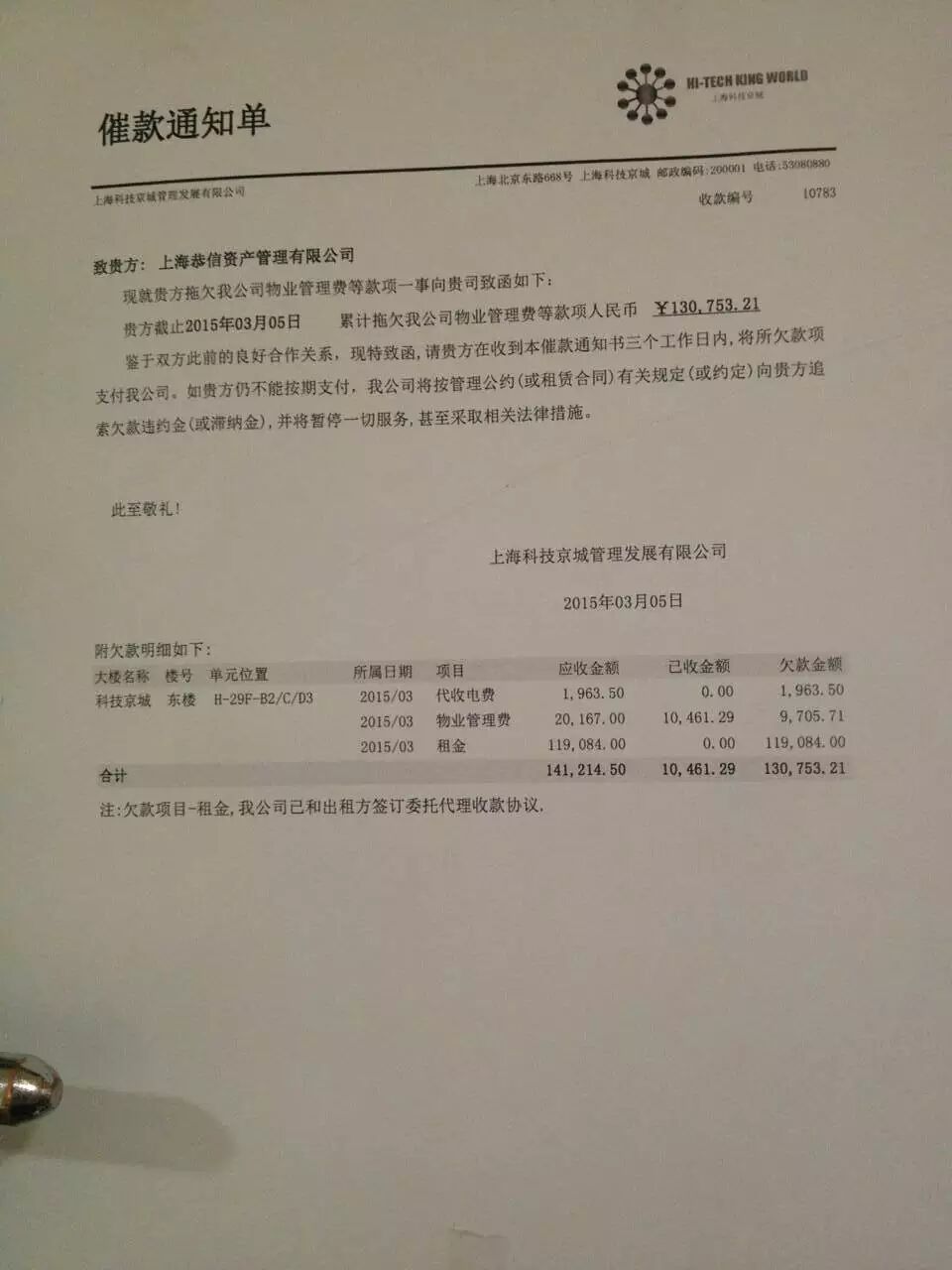这个是跑路平台办公所在地的物业公司公示的催款通知单,目前该跑路平台已拖欠物业公司一百三十余万相关费用..