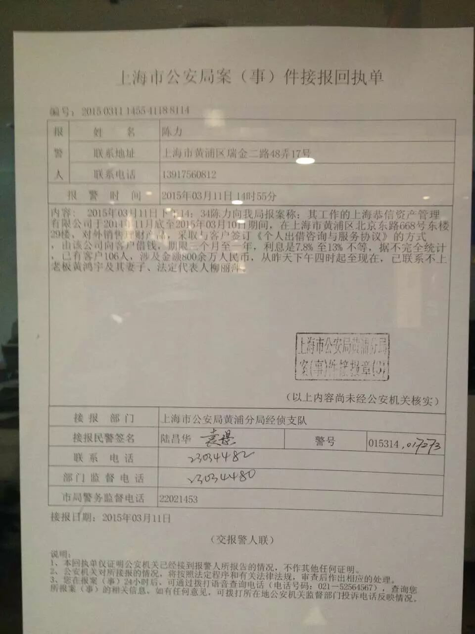 读者(受害投资人)原话:沙师弟你好!刚收到信息,上海恭信资产管理公司老板柳丽萍卷款跑路。金额800余万元,受害投资者106人。我已联系八十多位投资者,P2P日报是否来现场采访一下。****目前已立案调查……XXX……上海