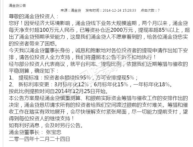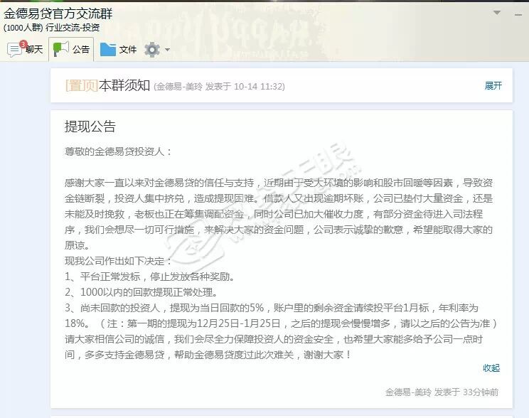 1、据网贷天眼论坛消息,据投资人发帖表示,目前浙江P2P平台涌金贷(http://www.yongjindai.com)体现困难,QQ群的管理员也全部下线。以下是该平台发出的公告以及QQ群截图。