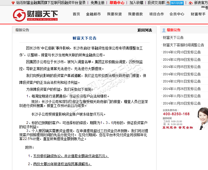 5、据网贷天眼论坛消息,已经被投资人爆料好几天的财富天下提现困难终于有了官方的说法,不过这借口真的是真够烂的,但也等于间接承认了提现困难了,至于理由是不是真的,谁也不好说,投资人还是小心为妙吧,附公告截图。