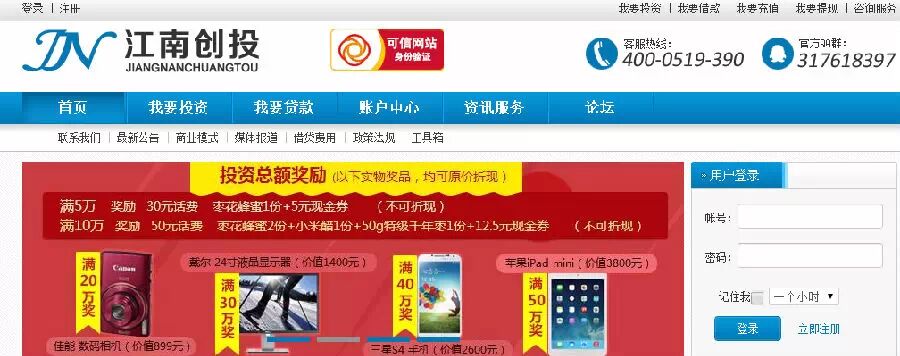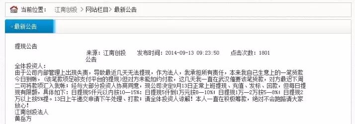 1、据悉,自9月9日江南创投出现提现困难,平台发出公告称9月13日会恢复正常。到了9月13日,平台又推脱至9月16日会恢复全额提现,这期间可按比例部分提现,1万可取560元。昨天,江南创投全面停止提现!